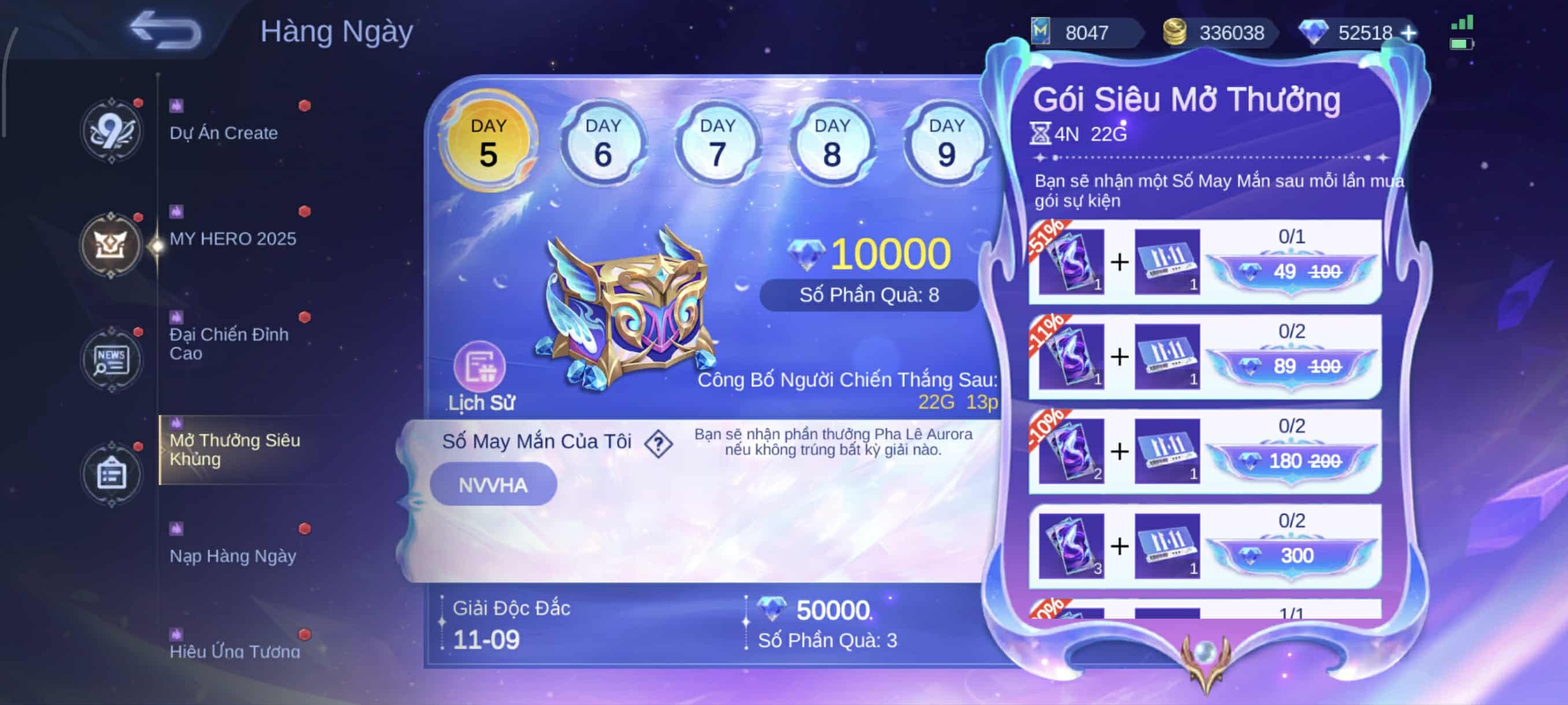 Tiếp theo, sự kiện Gói Siêu Mở Thưởng, có 2 gói đáng mua là gói 10 và 49 kc, sẽ nhận được 2 vé quay và 2 con số may mắn có cơ hội nhận thưởng lớn
